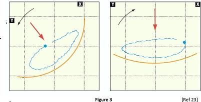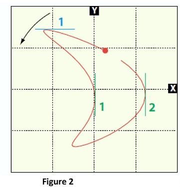 Starting at the phase trigger marker and moving around the orbit in the "blank to dot" direction (CCW in this example), count the number of positive peaks that occur in the X direction and in the Y direction. In this example, the X transducer sees two positive peaks in (one is smaller than the other), and the Y transducer sees only one positive peak. The X:Y frequency ratio is 2:1, with vibration components of 2X and 1X respectively. As seen in this example, the shape of an unfiltered orbit can provide important information about the frequency content of machinery vibration.