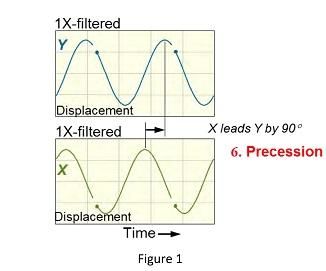 Once the Phase Trigger mark sequence is determined, it will show the direction of increasing time. This is the direction that the rotor moves in the orbit, regardless of the direction of rotation. The direction of precession can be compared to the direction of rotation to determine whether the precession is forward (vibration precession direction same as rotational direction) or reverse (vibration precession direction opposite rotation direction).