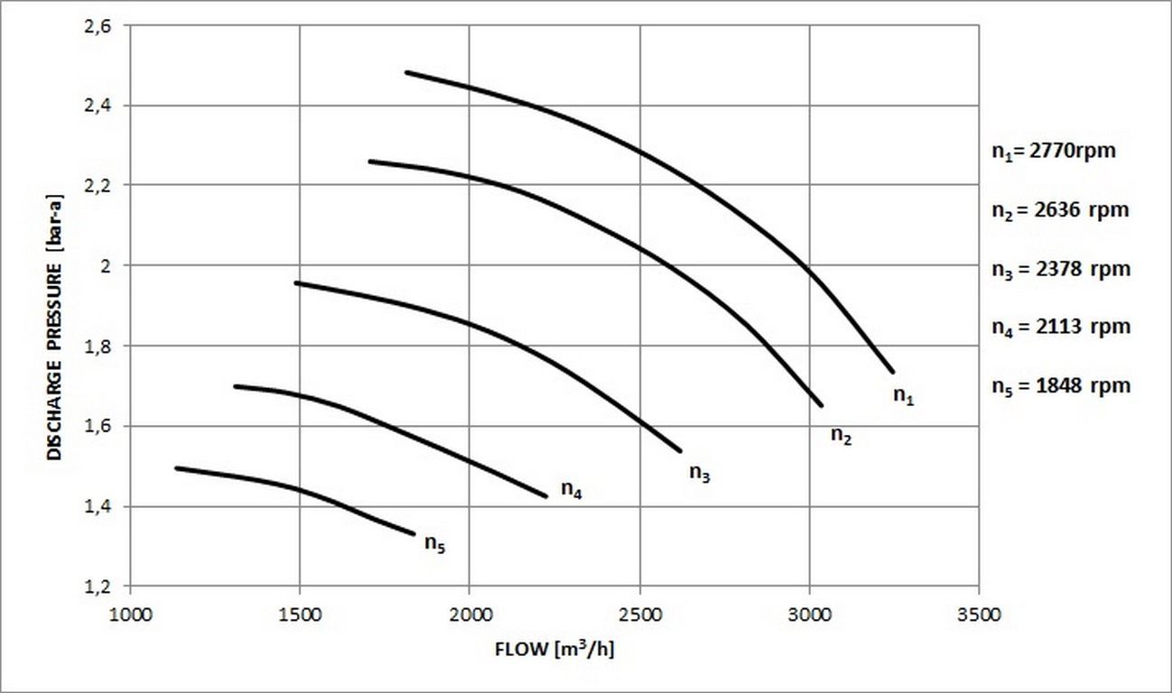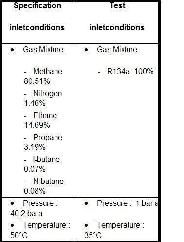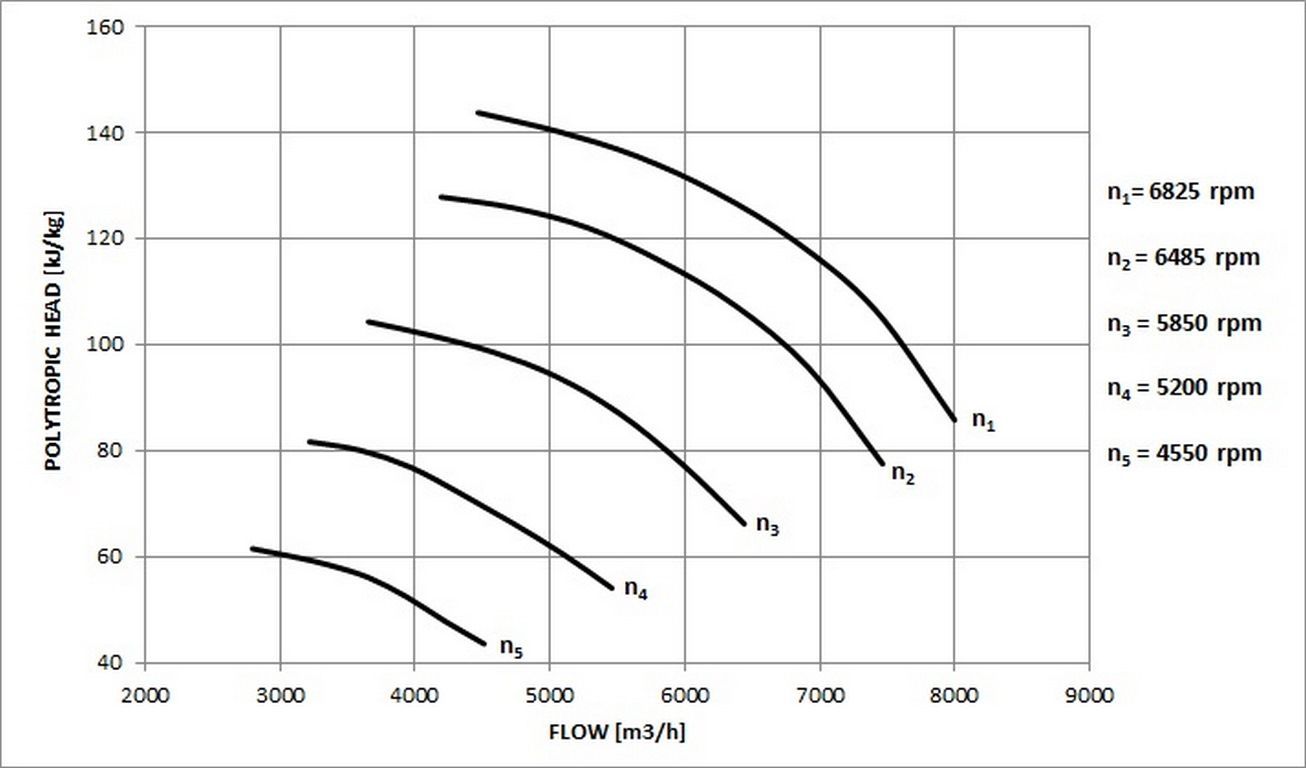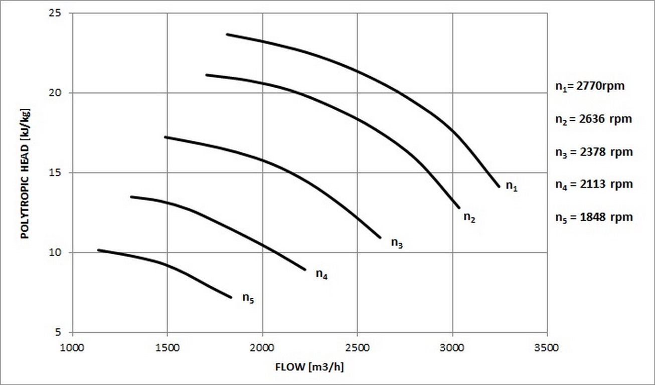 This equality of non-dimensional parameters among test and specification conditions, eliminates the requirement to test the centrifugal compressor at the same speed as OEM predicted performance in specification conditions and allow, within a certain range , to test with gas mixes different form the design one.