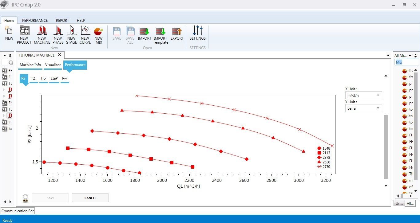 As said the starting point is the availability of an OEM centrifugal compressor performance curve in specification conditions, along with relevant gas mix composition and thermodynamic conditions (pressure and temperature). Having this input data available, the CMap software will perform all complex calculations in fully automated way and will produce the predicted compressor performances for test inlet pressures, inlet temperatures and Freon R134a different from the design / reference ones.