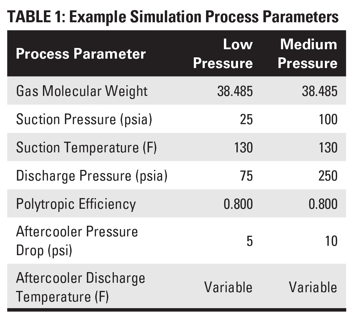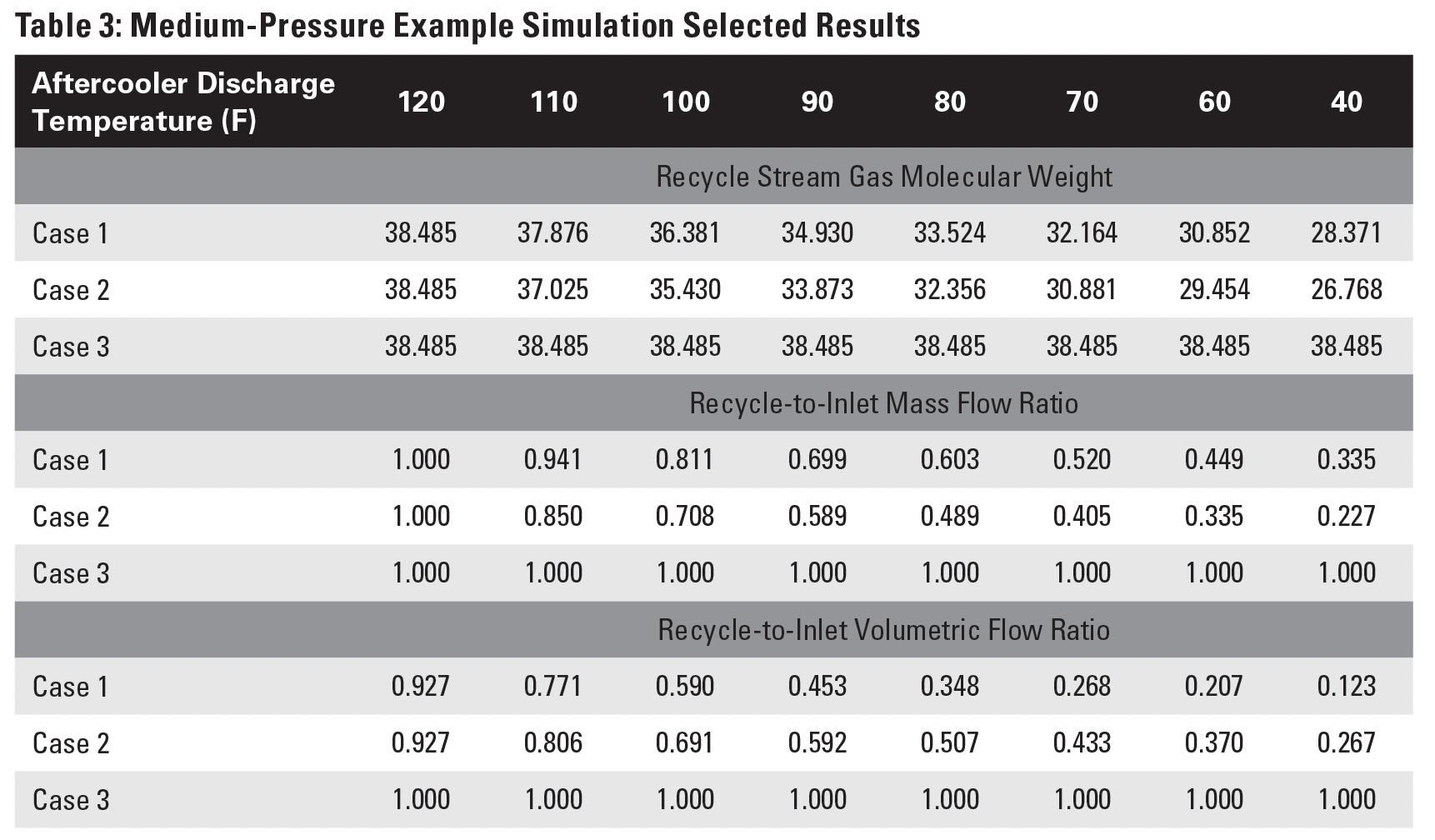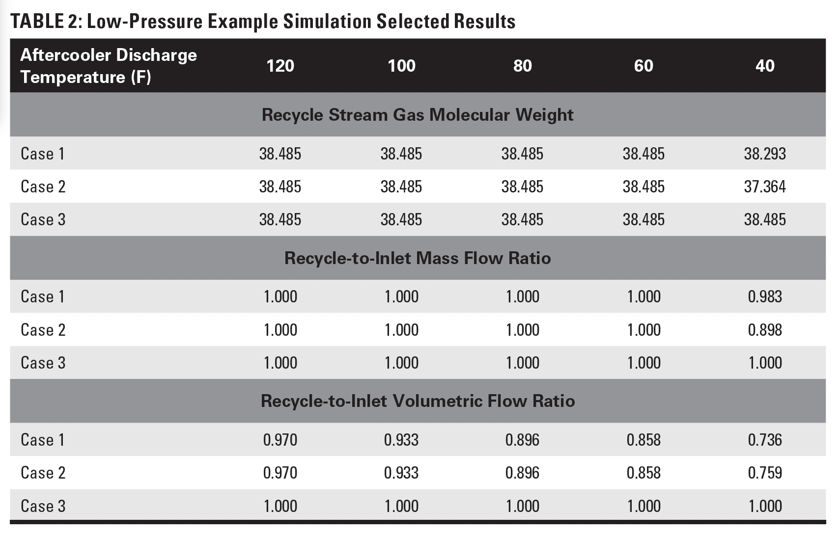 It is evident from the simulation results that minimal compressor-operational impacts are associated with wide variations in aftercooler discharge temperatures in the low-pressure example. Some impacts are related to the recycle volumetric flow rates that tend to decrease as the aftercooler discharge temperatures drop. The cause of this volumetric flow reduction is due to the throttling effect of the gas flow across the recycle valve, creating lower recycle valve discharge temperatures and the associated increase in gas density.