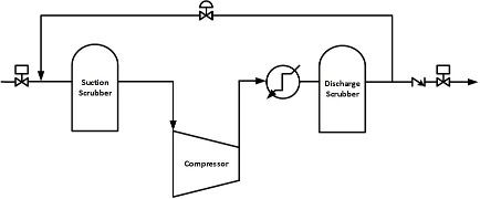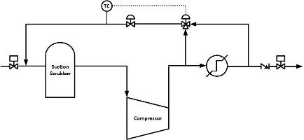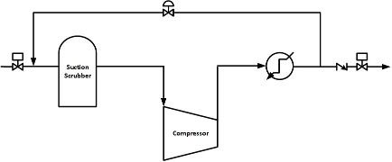 The basic configuration of a typical compressor system is shown in FIGURE 1. The inlet to a compressor section should include an isolation (block) valve and a suction scrubber that removes any entrained liquids from entering the compressor. Flow from the compressor section discharge will generally have a large portion of the heat of compression removed with some type of aftercooler with a check valve and discharge isolation valve downstream. The check valve is intended to prevent reverse flow during process upsets while the isolation valve is often held in the closed position during compressor start-up. A recycle line is provided downstream of the aftercooler to upstream of the suction scrubber to accommodate any required recycle flows during normal operation or upsets such as surge avoidance. The included valve supplies the necessary pressure drop from existing compressor discharge to suction pressure conditions. A single valve for both anti-surge and recycle services is often provided, but this may also be accommodated by separate anti-surge and recycle valves since their response times and position accuracy requirements can be different.