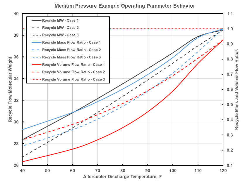 A more pronounced sensitivity to compressor-operating parameters with aftercooler discharge temperature is demonstrated in the medium-pressure example. All the selected operating parameters are impacted with more substantial reduction in all parameters with decreasing aftercooler temperature. An exception is illustrated in Case 3, where the aftercooler location is changed to downstream of the recycle valve. Reductions in both gas molecular weight and mass flow ratio are more significant for Case 2—the case that includes any condensate removal downstream of the aftercooler. This relative trend is switched in the volumetric flow reduction and is due to a combination of both gas molecular weight and recycle valve downstream temperature impacts on gas density.