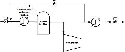 Three different operating scenarios are examined for each compressor example. The first scenario is the basic compressor configuration as defined in FIGURE 1, which is a common compressor layout with the cooled recycle line located downstream of the aftercooler. If any portion of the flow is condensed in the aftercooler, it is assumed that it will flow with the gas phase through the recycle valve and back to the compressor suction. All resulting liquid phase is then assumed to be separated in the compressor suction scrubber before the gas flow is re-introduced into the compressor. A second case is illustrated in FIGURE 3.