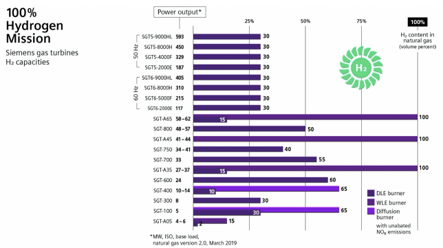 Similarly, the company has been enabling hydrogen operation in its medium and smaller gas turbines. The 24 MW SGT-600 runs on 60% hydrogen with near future targets of 75%, and the 50-62 MW SGT-800 runs on 50% hydrogen with an immediate target of 75% hydrogen.
