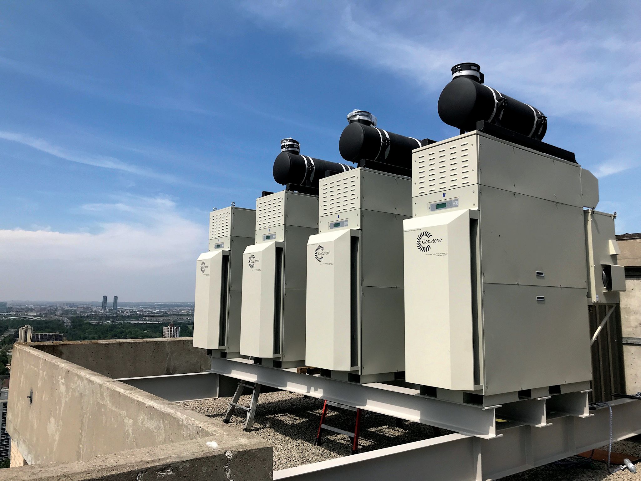 A group of Capstone C65 microturbines on a rooftop in Canada, powering an apartment building.[/caption]