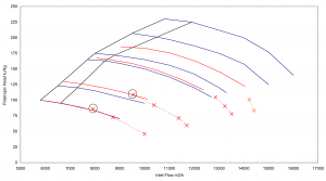 The performance points were plotted on the design performance curves. In addition, the fan laws were used to calculate additional ‘design’ speed curves, at compressor speeds equal to those used to gather the performance data. This allowed a direct comparison between the measured performance points and the calculated design speed curves. The plot is shown below -