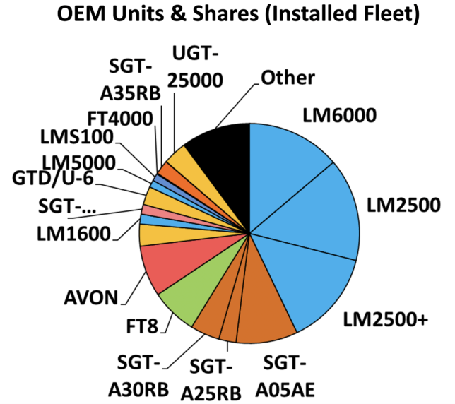 The number of units installed among the various aeroderivative fleets showing the extent of LM2500 family dominance. Courtesy of Dora Partners & McCoy Power Reports.[/caption]
