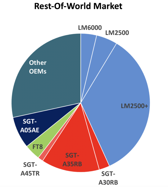 Siemens comes next with an 11.3% share. It offers a wide range of aeroderivatives including the SGT-AO5AE, SGT-A25RB, SGT-A30RB, SGT-A35RB, and the SGT-A45TR. These are primarily destined for oil & gas sites.