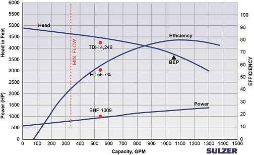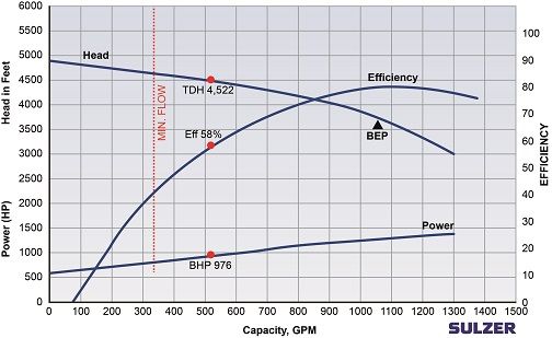 Figure 1: Pump actual operating point, flow limited to 58% of design point.[/caption]