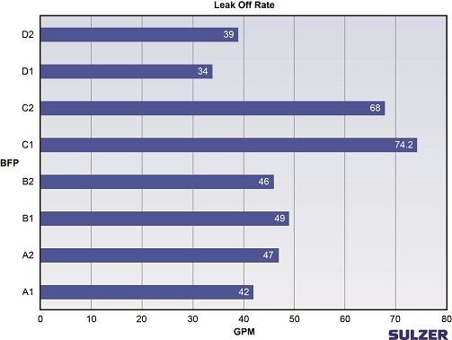 Balance line leak-off rate is an excellent and well-documented indicator of internal wear. Figure 3 graphically tabulates leak-off rates of the eight subject pumps and, as expected, the largest flow rate recorded was at BFP C1.