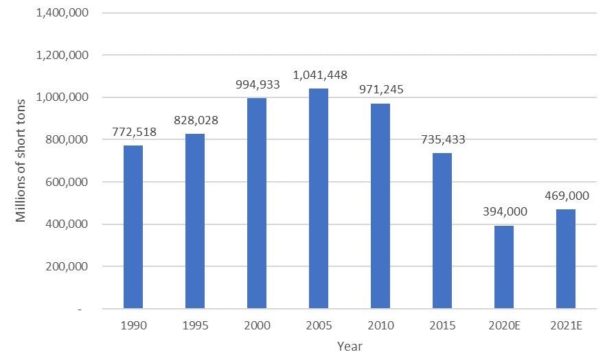Consumption of coal by U.S. electric generators. Source: Electric Power Monthly and Short-Term Energy Outlook reports, U.S. EIA.[/caption]