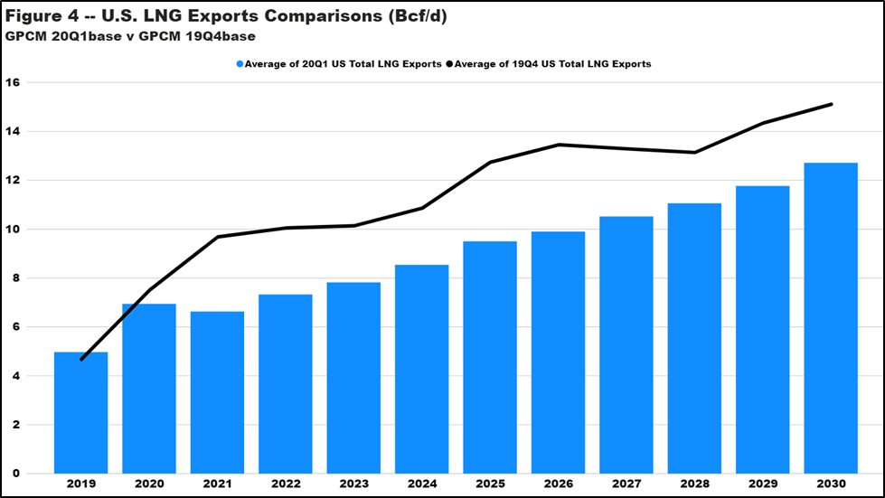 RBAC’s forecast of U.S. LNG exports made in Q4 2019 compared to the latest forecast in blue. Source: RBAC’s GPCM Natural Gas Market Forecasting System outlook.[/caption]