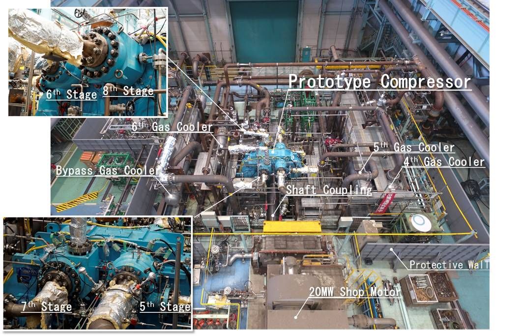 An integrally geared CO2 centrifugal compressor (2,900 psiG/20 MPaG discharge pressure level) was designed, manufactured and evaluated for fluid dynamic performance and rotor stability. Full-load and full-pressure tests were carried out using real CO2 gas (Figure 3). Compressor fluid dynamic performance was excellent even at high pressure supercritical gas conditions at the high-pressure stages of the compressor. Rotor vibration remained low even at high pressure.