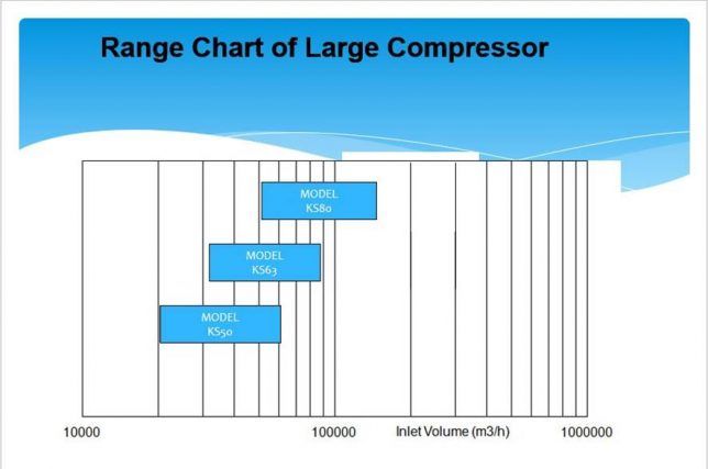 Large-capacity, oil-free screw compressors are widely used in the petrochemical, petroleum refining and gas processing industries. The most popular application for these compressors is in the styrene monomer process in petrochemical plants. Since this application needs high capacity, Model KS63 (rotor diameter of approximately 63 cm) is often adopted.