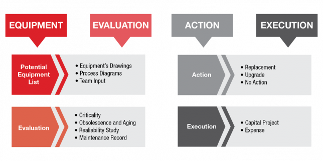 Under this pillar, the equipment road map must be initiated. The first and most important step is setting a list of equipment. Information for equipment is gathered, such as drawings, data sheets, process diagrams, and input from different disciplines. The second step is the evaluation process, comprised of a criticality assessment. This includes equipment obsolescence and age, previous reliability studies, and maintenance records. The third step defines the action needed for each equipment item, such as replacement, upgrade, or no action is required. The final step is choosing how and when the action will be executed. Is it going to be through capital project or expense?