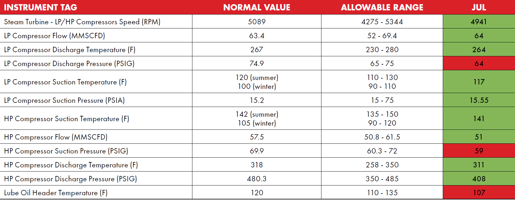 Different processes and mechanical parameters are monitored on a monthly basis, such as suction/discharge pressures and temperatures, flow, and bearing vibration and temperature. The normal and allowable range of each parameter is defined to identify any abnormal reading. This allows the reliability engineer to compare values from different months, as well as acting on and providing recommendations before reaching alarm conditions.