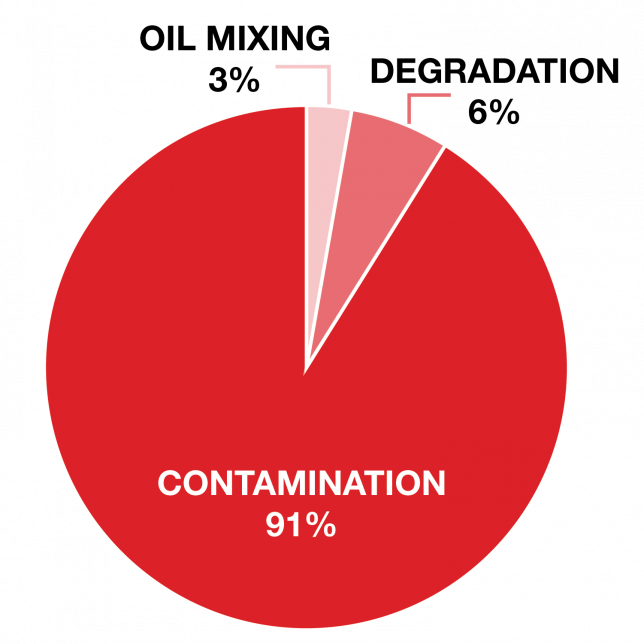 In the Abqaiq Plants oil samples are monitored for 89 equipment items. Physical and chemical property analysis is performed quarterly to look for issues such as bearing particles in the oil. Failure modes of lube oil samples are categorized as follows: oil mixing, degradation, and contamination.