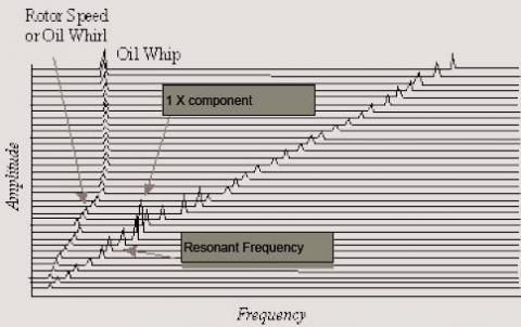 It was discovered that hot oil was causing the bull gear of the gear box to vibrate and this was being transferred to the pinion. This effect directly caused a vibration peak on the compressor shaft at the bull gear’s operating frequency. The detailed spectrum and analysis of the compressor rotor did not show any internal instability of any kind. Even during coast down, a high momentarily peak was observed caused by high train inertia contributed by huge rotational inertia of the motor (Figure 4).