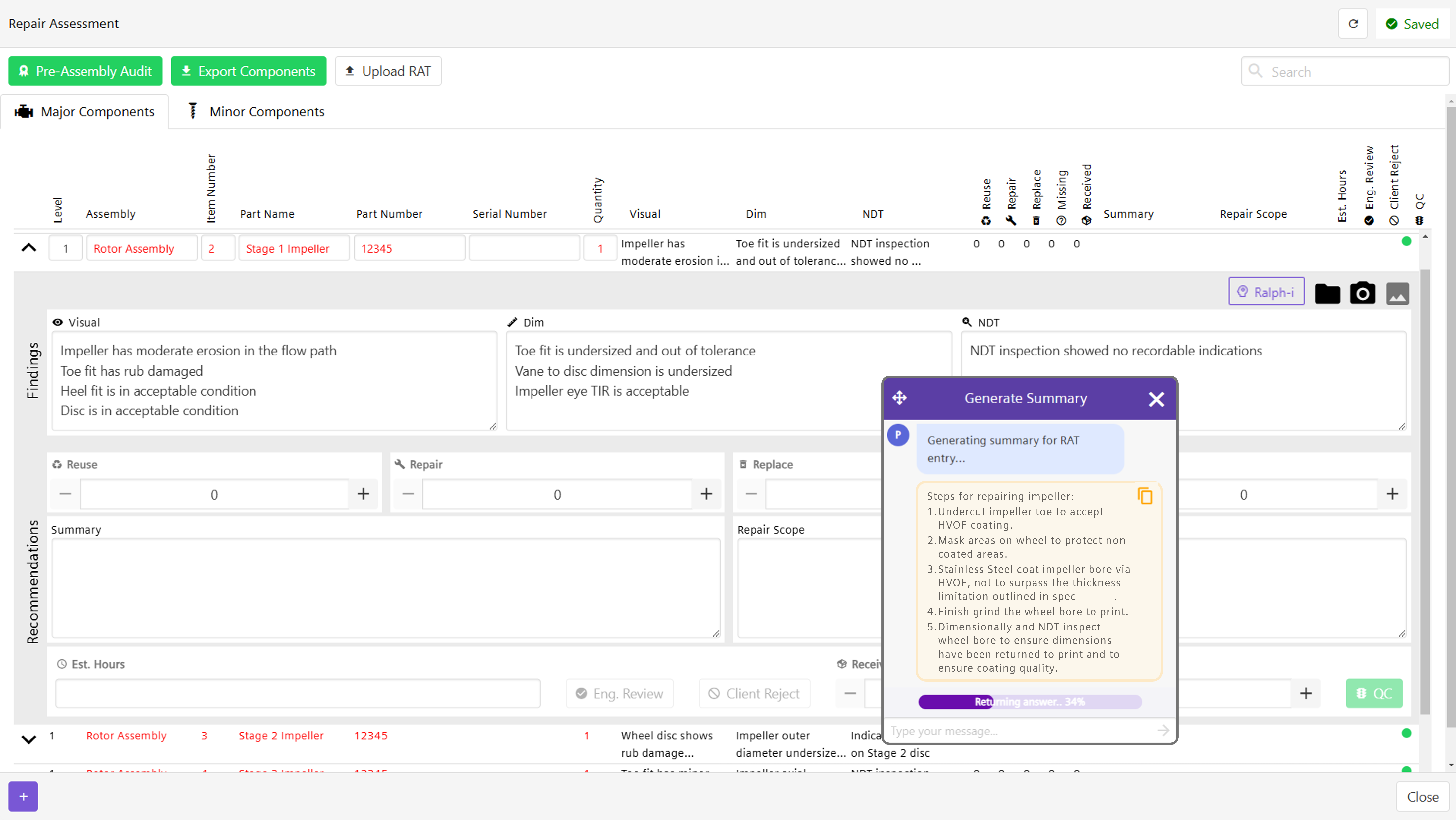 FIGURE 1 is a screenshot from the digital inspection platform showing how the scan results, along with data from manual procedures such as non-destructive testing (NDT), can be used to generate prescriptive repair recommendations using Gen AI. All the information is mapped to enterprise resource planning (ERP) and product lifecycle management (PLM) systems, which allows sales and repair personnel to provide faster and more accurate responses to customers on lead times and costs.
