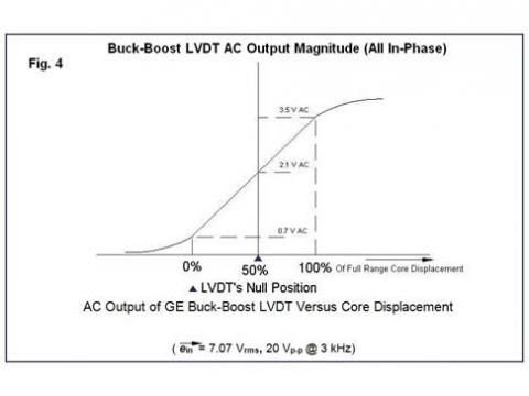 The result is plotted in Figure 4, which shows that the total AC output from this connection of secondaries and the 30% tap is a voltage of 0.7 to 3.5 V ACrms, with no 180 degree phase shift as the LVDT's core moves from one end of range, through null, to the other end of range.