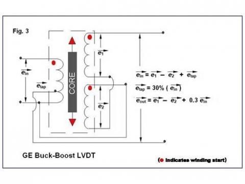 This LVDT hookup is generally known as a "Buck-Boost" configuration. As you can see in Figure 3, the voltage appearing at the tap is 30% of the excitation voltage being applied to the LVDTs primary, and is in phase with the primary voltage. The way the windings are connected, this 30% voltage, e tap, is being added to the differential secondary voltage, which consists of e1, which is in phase with the primary voltage to which has been added e2, which is 180 degrees out of phase with the primary voltage. The turns ratio of these GE LVDTs is usually about 5:1, so, with a 7.07 V ACrms input, the full scale secondary output, without the effect of the 30% tap, would be about 1.4 V ACrms, either in phase with the primary excitation, or 180 degrees out of phase with it. However, the 30% tap inserts an additional 2.1 V ACrms that is in phase with the primary excitation that is now added to the voltage already in the secondaries.