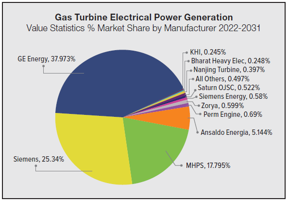 GE Energy is predicted to remain top in terms of market share in overall gas turbine revenue over the next ten years. It represents 38% of the pie, followed by 25% for Siemens Energy, Mitsubishi Power with 18%, and Ansaldo Energia with 5%. Together, these 5 companies will account for more than 80% of gas turbine revenue between now and 2031.