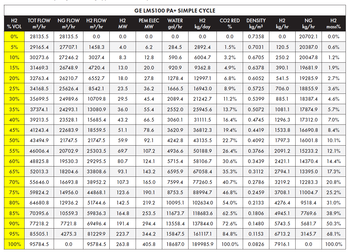 Table 2 provides a mathematical model of a blending application for a 60Hz GE LMS100 PA+ gas turbine genset operating in simple cycle mode. Figures presented are based on published full-load, beginning-of-life performance for the LMS100 PA+, based on data from GE Gas Power. Based on the relative density and LHV differences between natural gas and hydrogen, one can see the total flow more than triples as you approach 100% hydrogen operation. (This model assumes the line pressure does not change across the range of blending %.) An important consideration for retrofit applications is accommodating this increase in volumetric flow once the 75% blending threshold is approached, where total flow is approximately doubled. Existing piping infrastructure supplying the genset, as well as the fuel delivery piping at the combustors, will need to be evaluated for the increased relative pipe velocities this will result in.