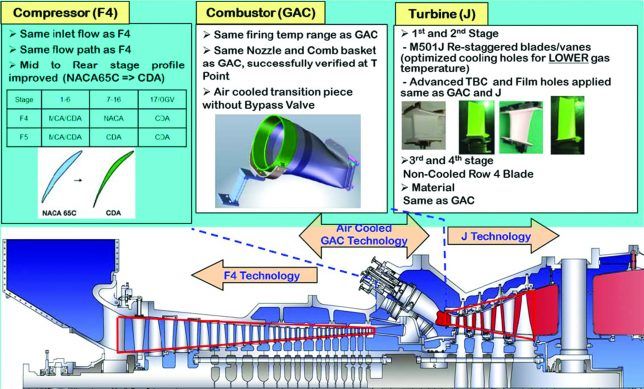 This development has also been incorporated in the F5. It is able to at 1,500ºC TIT courtesy of: J-class turbine Rows 1 and 2 blades and vanes; G-class air cooled (GAC) combustors and transition pieces; and GAC class turbine rows 3 and 4 blades and vanes (Figure 2).