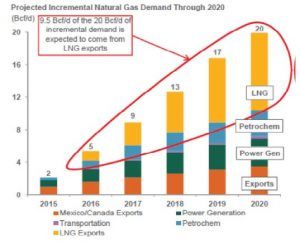 Along with the growth in LNG exports, pipeline exports to Mexico will increase as 3.7 Bcf of pipeline capacity to Mexico is slated to come online in the next 18 months. Combining LNG with pipeline exports andplus of natural gas should be reduced. One forecast suggests that existing demand (78 Bcf/d in 2016) should approach 95 Bcf/d by 2020 (Figure 2).