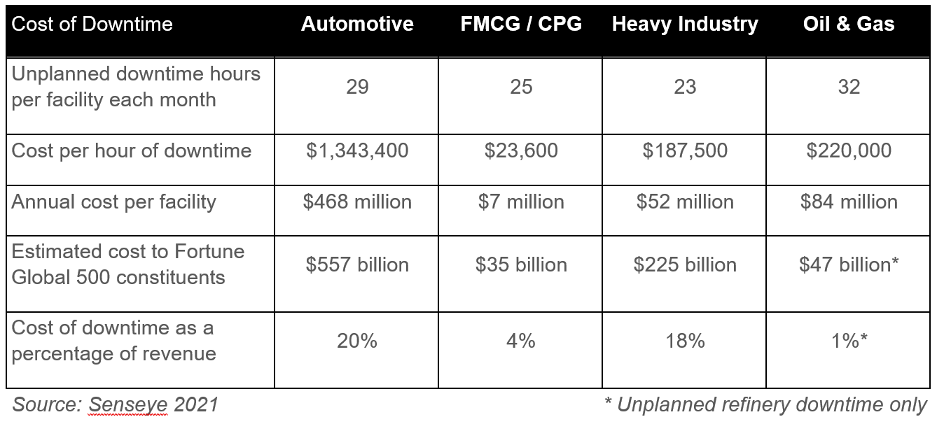 A study of major industrial firms by Senseye finds that large facilities lose 27 hours a month to machine failures on average at the cost of $532,000 for each hour of unplanned downtime. These losses are estimated to total 3.3 million production hours, worth $864 billion per year across Fortune Global 500 industrial companies.