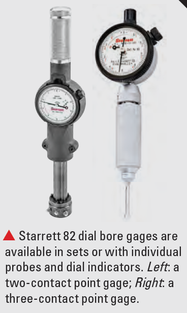 Dial bore gages are available in two- or three-point contact with a choice of dial reading, imperial, metric, or fractional graduations. Measurements are taken by comparison, so some type of setting master should be used as a reference standard. Set the gage as close to the hole being measured as possible to maximize the hole measurement.