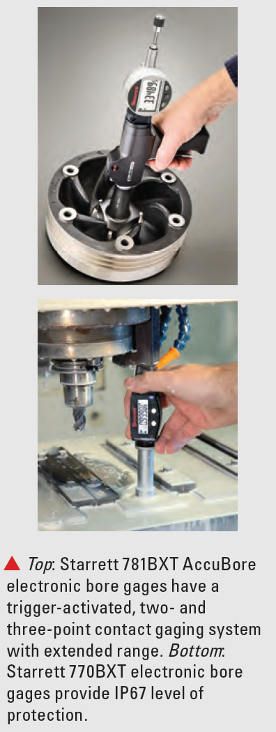 As previously mentioned, electronic gages enable measurement data collection and documentation for SPC purposes, which is an advantage over dial or vernier gages. In addition, some electronic gages are IP67-rated for protection against harsh ambient shop environments with coolant, dust/dirt, etc. There are also unique pistol grip gages with trigger activation that allow for fast access to the hole being measured. Both vernier and electronic gages are available in two- or three-point contact styles.