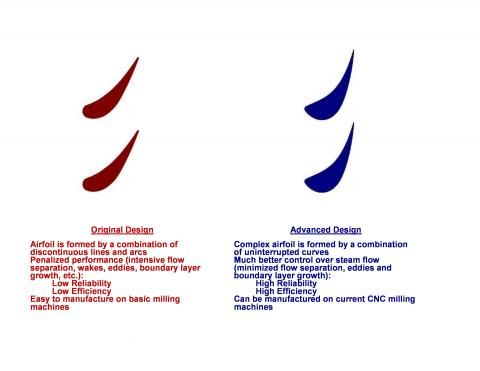 Figure shows the comparison between the original and current airfoil designs. The old airfoils form a channel in which steam flow accelerates and turns to exit with maximum steam velocity resulting in high secondary losses.
