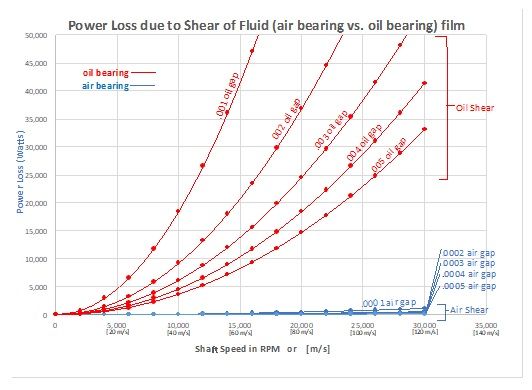 Fig 6. Comparison of shear power losses between oil and air within their operating range. These losses are from the traction the rotor gets in the oil and responsible for the destabilizing cross-coupled stiffness terms.[/caption]