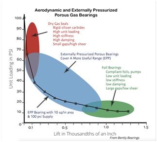 Fig 4. This is a “big picture” chart to conceptualize gas-bearing technology in turbo equipment. It is a lift vs. load chart for an externally pressurized porous (EPP) gas bearing that has 10 square inches of bearing face; 100 psi is fed to the bearing as the load on the bearing is increased. Resulting air gaps are shown on the bottom axis. The slope of the curve is representative of the film stiffness. The typical operating regions of dry gas seals and foil bearings are superimposed, as is the operating area for EPP Bearings. It can be seen that the EPP Bearings operate with a larger gap than dry gas seals, reducing heating and contact issues but still having good stiffness, damping and speed capabilities.[/caption]