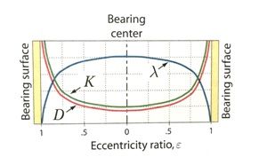 Fig 1. Qualitative plots of fluid-film bearing parameters versus journal eccentricity ratio. Stiffness, K, and damping, D, are minimum when the journal is at the center of the bearing, and they are approximately constant for low eccentricity ratios. As the journal nears the bearing surface, stiffness and damping increase dramatically. λ behaves the opposite way.[/caption]