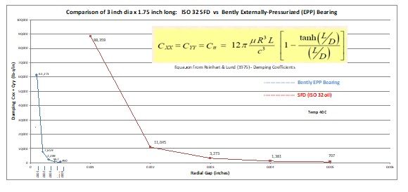 Oil hydrostatic bearings will suffer from heat generated by shear in the film at higher speed as was case with the oil hydrodynamic bearing, but because of the external pressure, the film thickness may be made to remain the same, essentially an eccentricity of zero and a low enough stiffness to have motion for damping. As compared to the oil hydrodynamic bearing where lower viscosity oil will result in lower film thickness. The lower film thickness results in higher stiffness and damping as shown in the eccentricity ratio plots, but the increases may not be useful.