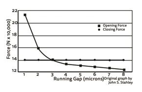 The spring rate of a fluid film is primarily dependent on its film thickness- the thinner the gap the higher the stiffness. This is well known and documented in eccentricity ratios of hydrodynamic oil journal bearings, figure 1. Stiffness curves of dry gas seals, figure 2, and commercially available externally pressurized gas bearings, figure 3. Notice in every case that the stiffness is increasing exponentially at the smaller gaps.