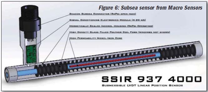 “The LVDT provides position feedback to a surface-based monitoring control system for the compressors,” said Sidhu. “LVDTs are more reliable than other position feedback devices in these applications as these sensors can perform in depths up to 15,000 feet with high accuracy.” Macro Sensors has designed its SSIR 937 Series Submersible LVDT Position Transmitter to withstand deep sea environments with external pressures up to 7,500 psi. Inconel construction enhances the assembly to meet a 20-year lifespan even if exposed to seawater at depths up to 15,000 feet (Figure 6).