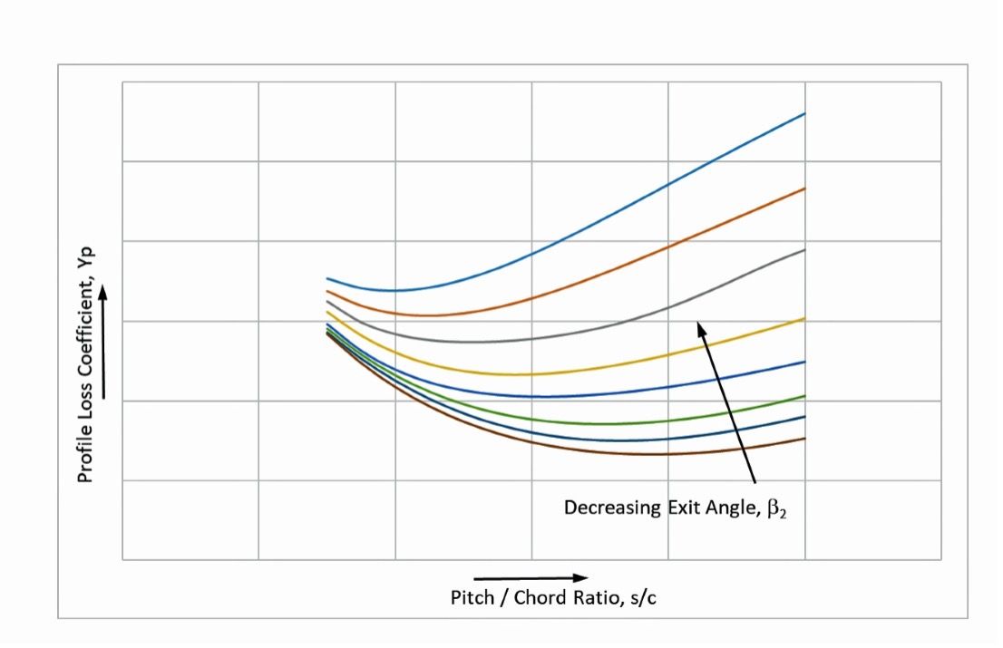 The profile loss is a function of the pitch-to-chord ratio (s/c), the turning angle, and the incidence. The variation of the base profile loss coefficient, Yp, as a function of the s/c ratio and the bucket exit angle is shown in Figure 3. An increase in the airfoil count causes an increase in the frictional losses and a corresponding reduction in the loading losses. Reducing the airfoil count has the opposite effect, where the loading loss increases while the frictional losses decrease. The minimum total pressure loss occurs at s/c values where the combined losses due to friction and loading are at a minimum (Figure 4).
