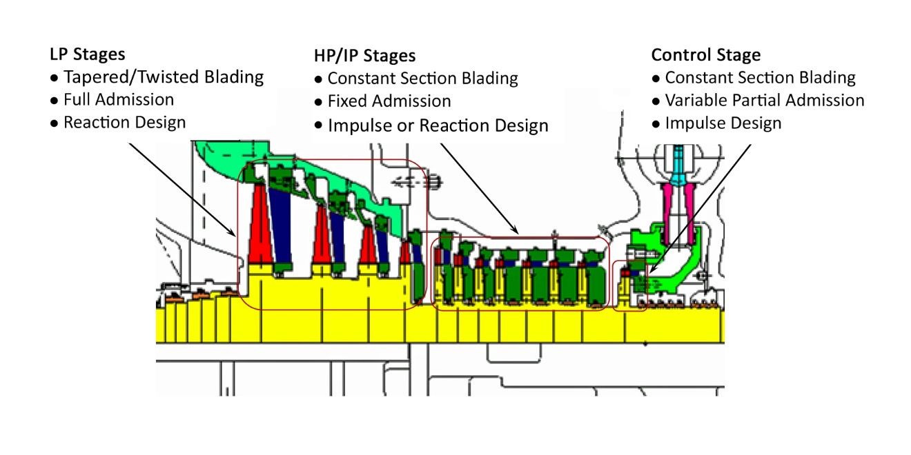 Figure 5. Condensing Turbine Flow Path (Rashid, S., and Rao, N. M., 2022, Steam Turbine 201 Course – Steam Turbine Aerodynamics). Presented at the 51st Turbomachinery & 38th Pump Symposia, August 2022.