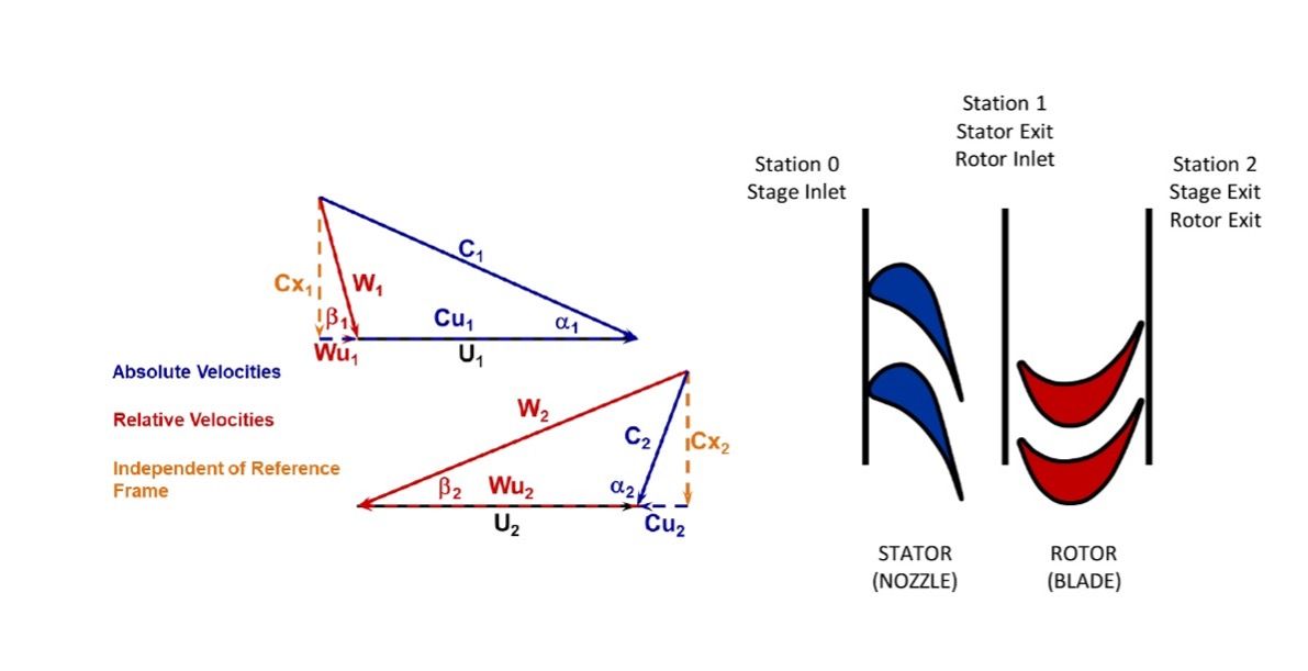 Figure 2 illustrates a pressure-compounded axial turbine stage and velocity triangles. The three locations at which fluid properties and flow velocities are defined are Station 0, Station 1, and Station 2. Station 0 is at the inlet to the stage. Station 1 is common to the stator exit and the rotor inlet. Station 2 is at the rotor and stage exit. The velocity triangles at Station 1 and Station 2 are also shown where: