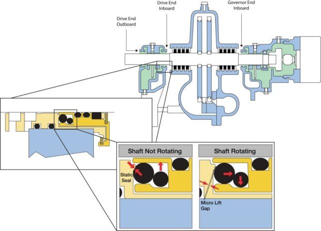 Replaceable rotating labyrinth devices can be installed in existing machines without bearing housing modifications. Unlike traditional fixed labyrinths, they use centrifugal force to expel potential contaminants before they reach the oil. During periods of operational idleness dynamic (axially moving) vapor-blocking O-rings provide a secondary level of protection and compliance with the requirements in API-611, paragraph 6.10.4.2.1. Lubrication protection must be effective when the equipment is running and when not in operation. With traditional labyrinth seals, moisture aspiration occurs. As the equipment cools, the surrounding ambient air is drawn into the bearing housing.