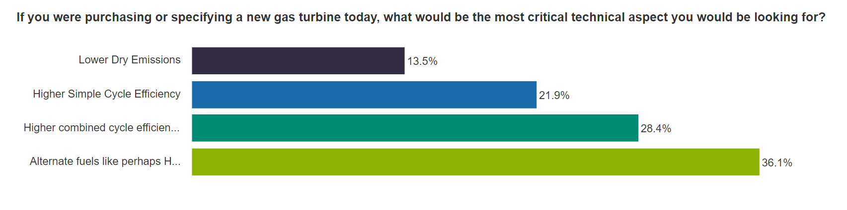 36.1% chose alternative fuel capability as the most critical deciding factor when purchasing a new gas turbine, 28.4% gave the greatest emphasis to higher combined cycle efficiency and 21.9% to better simple cycle efficiency. Only 13.5% of respondents picked dry low emissions.