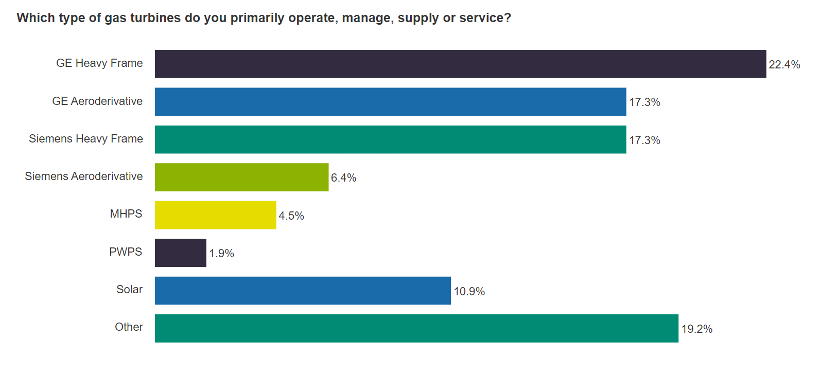 The survey also asked users which type of gas turbines they primarily operate, manage, supply or service? 22% of respondents primarily use GE Heavy Frame turbines and 17.3% use GE aeroderivatives. Siemens Heavy Frame users gained 17.3% while Siemens aeroderivative users represented 6.4%. 10.9% of respondents use Solar equipment with 4.5% using turbines from Mitsubishi Hitachi Power Systems (MHPS).