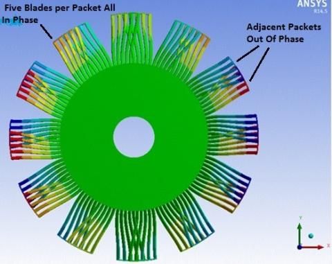 For certain numbers of blades and packet selections even tuned assemblies will respond. With a change to 112 total blades and using seven packets with 16 blades there would be phase cancellation if the 3-diameter mode was resonant with 5 times speed. However the possibility of mistuned packets should also be considered, not only from design and manufacturing differences, but from changes during operation such as from erosion/corrosion. Using many more blades per packets than five or six is usually much better for phase cancellation. An example of experimental results for a case with 12 packets, resonant with 3X is shown in Figure 10 of Reference 5.