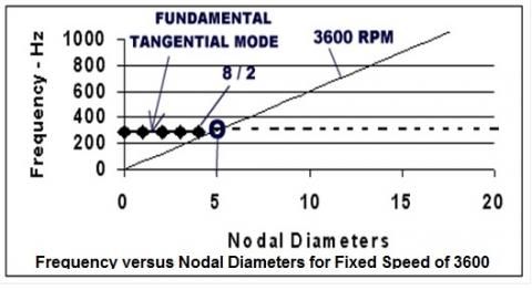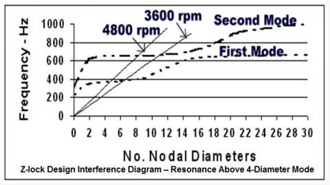 An example of nodal diameter “critical speeds” is shown above where there are 60 interlocked blades with a speed range of 3600 to 4800 rpm.