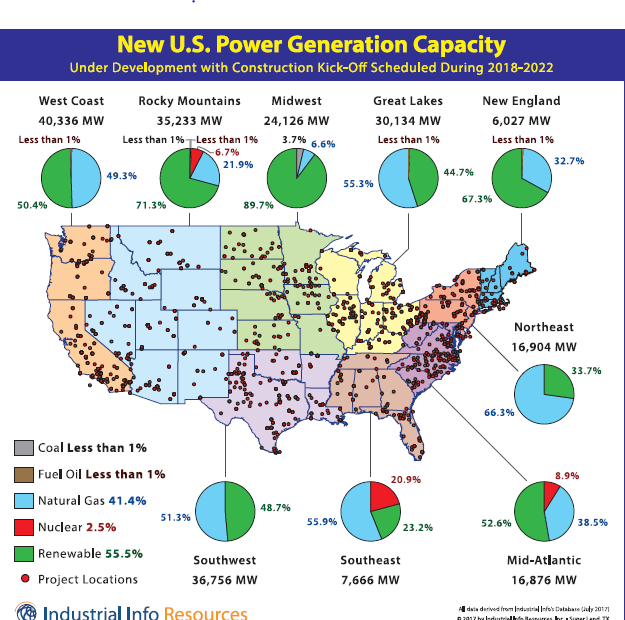 On a percentage basis, the Midwest, Rocky Mountains, New England and Mid-Atlantic regions should see the most activity. The Midwest expects to see 21,637 MW of renewable energy projects kicking off construction between 2018 and 2022.