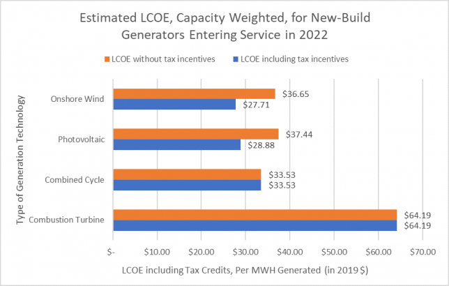 Figure 9: Levelized cost of electricity for new-build plants entering service in 2022 (measured in 2019 dollars). Source: EIA.